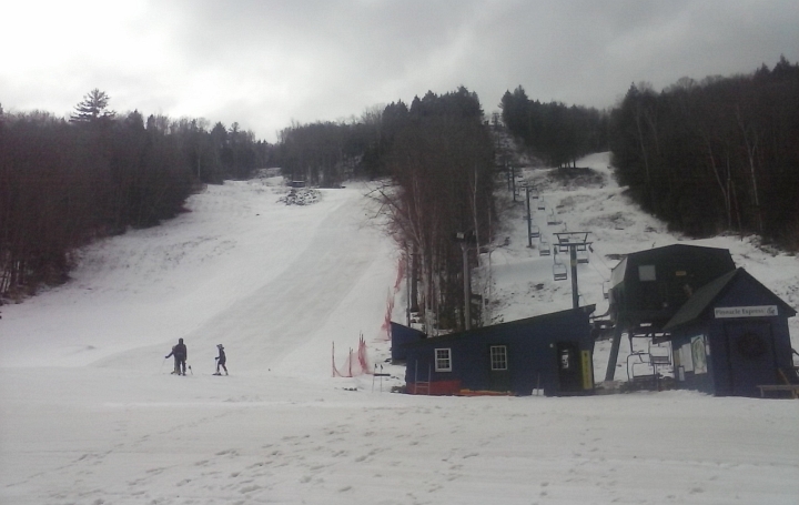 It was a day of spring skiing with hero snow at both Granite Gorge and McIntyre. Granite Gorge had two routes from the top open plus a run from the mid-station. There was a race course set up on Main Street which was open to anyone. Crowds were very light and there was never a wait. McIntyre had everything open except the new trail and everything still had great cover. It was slightly more crowded there, but lines were never long and only one chairlift needed to be in operation.